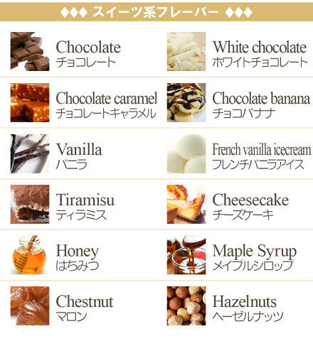 ■商品ラインナップ ■バニラ ■チョコレート ■ヘーゼルナッツ ■栗 ■ホワイトチョコレート ■チョコレート キャラメルピーナッツバター ■チョコバナナ ■チーズケーキ ■ティラミス ■蜂蜜 ■フレンチ バニラアイス ■メープルシロップ ※他にもリキッドの種類がございますので、 気になる方はコチラからどうぞ♪